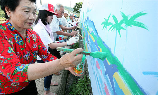 제2회 진안군 마을축제 개막을 앞두고 금지배넘실마을에서 주민들과 체험학습 나온 학생들이 건물벽에 벽화를 그리고 있다.
