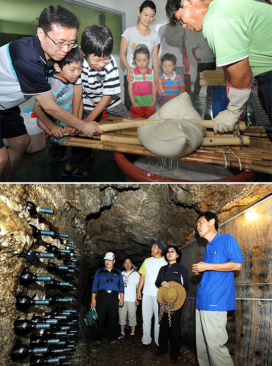 진안 마을만들기 축제중 성수면 중길마을의 전통두부 만들기 체험(위)과 안천면 노길마을의 와인동굴.