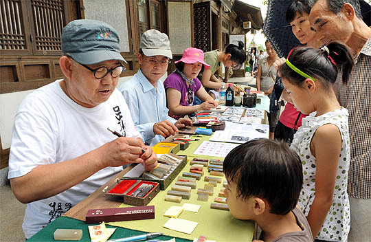 서예가 여태명 원광대 교수가 전주한옥마을 공예품전시관 앞에서 나들이 나온 가족들에게 인장을 파 주고 있다.