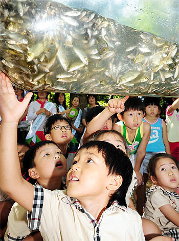 오송제 생태계 회복과 수산자원을 증강하기 위한 토산어종 방류행사가 5일 전주 오송제에서 열려 오송제 지킴이 회원들 및 관계자들이 토산어종인 붕어·잉어 등 3만5000마리를 방류했다.