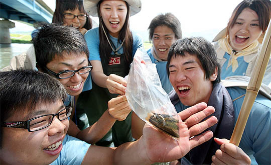 '제1회 한·일 하천 에코캠프'에 참가한 양국의 대학생들이 행사 3일째를 맞은 5일 만경강 상류 고산천에서 잡은 물고기와 하천 생물을 보며 즐거워하고 있다.