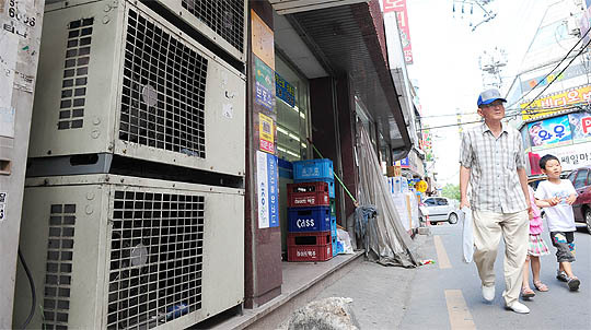전북대학교 대학로의 한 상점 에어컨실외기가 인도 쪽에 설치되어있어 길가 던 시민들이 뜨거운 열기 때문에 고통을 호소하고 있다.