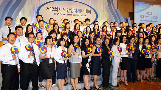 10일 오전 홍은동 그랜드힐튼호텔에서 재외동포재단주최로 열린 '2009 세계한인 차세대대회'에 참석한 재외동포 차세대 인재들이 부채를 들고 포즈를 취하고 있다.