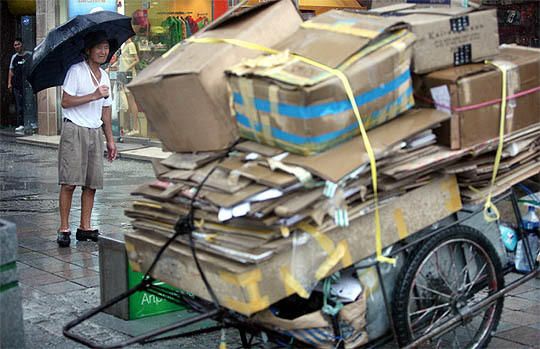 종이 박스를 수레에 실어가던 할아버지는 갑작스런 소나기에 당혹스럽습니다. 종일 모았던 종이 박스가 비에 젖어 사용할 수 없게 될까 걱정이기 때문이죠. 벌써 비에 젖어 수레가 무거워진 느낌입니다. 그래서 비를 피해 잠시 쉬어가기로 했습니다. 일당을 할 수 있게 비가 빨리 그쳐야 할 텐데요.