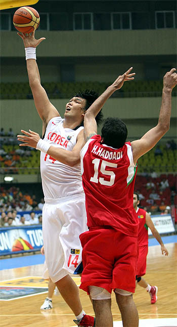 한국 농구대표팀 하승진이 12일 중국 톈진 체육관에서 열린 '제25회 FIBA ASIA남자농구선수권대회' 이란과의 경기에서 이란 하다디의 마크를 피해 골밑슛을 시도하고 있다.
