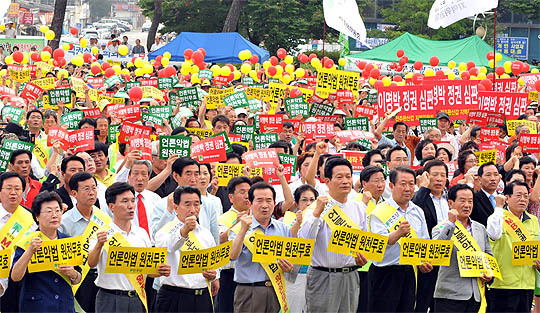 언론악법 원천무효 전북지역 규탄대회가 13일 오후 5시 전주시청 앞 노송광장에서 정세균 민주당 대표, 이강래 원내대표, 강봉균 전북도당위원장을 비롯해 도내 국회의원, 시민단체, 언론노조 관계자와 민주당원, 도민 등 5000여 명이 참석한 가운데 열렸다.
