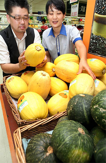13일 하나로클럽 전주점에서 다이어트 효과가 좋은 단호박과 삶아서 국수처럼 먹을 수 있는 국수호박을 직원들이 살펴보고 있다. 호박은 탄수화물과 섬유질, 각종 비타민이 듬뿍 들어있어 좋은 영양식으로 알려져 있다.