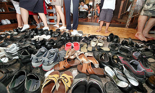 말복이었던 13일 정오 전주시 중화산동의 한 음식점에 원기보강을 위해 삼계탕을 먹으러 온 손님들로 붐벼 손님들이 신고 온 신발로 현관이 가득 메워져 있다.