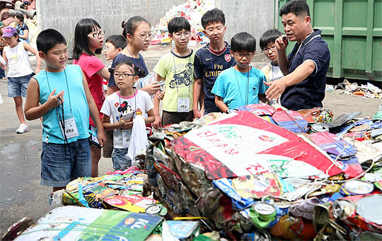 13일 전주재활용선별장에서 폐기물처리시설 답사에 참가한 어린이들이 압축된 캔과 고철을 보며 전주시 환경과 임현완 담당의 설명을 듣고 있다.