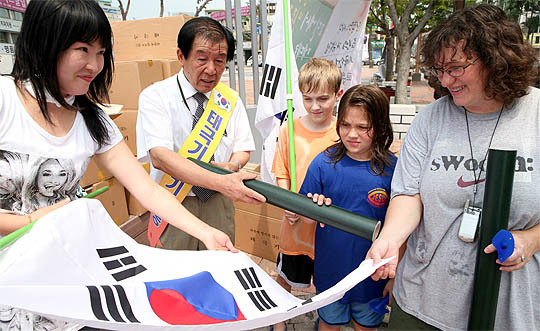 14일 전주 오거리문화광장에서 광복회전북도지부 이영철 회장(왼쪽에서 두 번째)과 회원 20여명이 태극기를 나눠주는 행사를 가져 한 외국인 가족에게 태극기를 나줘 주고 있다.