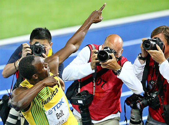 17일 오전(한국시간) 독일 베를린 올림피아 슈타디온에서 열린 2009 세계육상선수권대회 남자 100m 결승에서 우사인 볼트(자마이카)가 세계신기록(9초58)으로 우승한 뒤 세리머니를 펼치고 있다.
