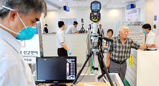 국내에서 신종인플루엔자 감염에 의한 사망 사례가 두 번째로 발생한 가운데 20일 군산여객선 터미널에서 국립군산검역소 직원들이 여행객들을 상대로 열감지 카메라를 이용하여 이상 유무를 체크하고 있다. 이날 검역소 직원들은 여행객을 상대로 3중에 걸쳐 검역을 강화하고, 신종플루 예방을 위해 향균 비누와 물티슈등을 나눠주며 예방활동도 벌였다.