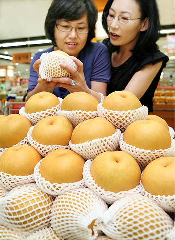 조금씩 가을이 고개를 내밀고 있는 24일 하나로클럽전주점에서 고객들이 조생종 햇배를 고르고 있다. 배는 사과와 함께 가을의 대표적인 과일로 기침 및 가래제거에 효능이 있고 해열효과와 소화촉진 효능이 있는 것으로 알려져 있다.