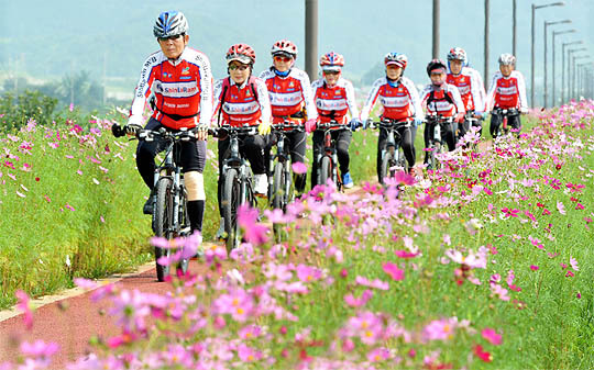 처서가 하루 지난 24일 전주 삼천 자전거 길에는 요즘 코스모스가 활짝 꽃을 피워 가을의 분위기를 물씬 풍기고 있다. 전주 신바람 자전거 동호회 회원들도 가을 바람을 일으키며 신나게 달린다.