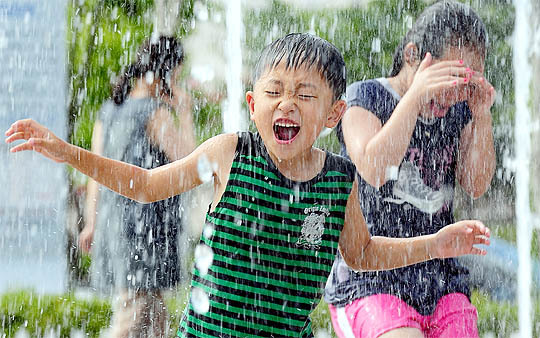 24일 전주 효자동 바닥분수에서 아이들이 시원한 물줄기를 맞으며 더위를 식히고 있다.