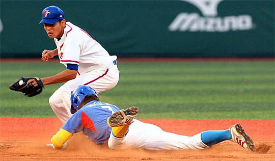 25일 서울 목동야구장에서 열린 제8회 아시아청소년야구선수권대회에서 한국의 문상철이 1타점 적시타를 친 뒤 2루로 돌진해 세이프되고 있다.