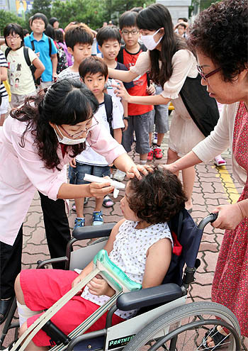 신종플루의 학교내 집단감염 예방을 위해 28일 전주 송원초등학교에서 아이들이 교실로 입실하기 전 교문 앞에서 체온검사를 받고 있다.