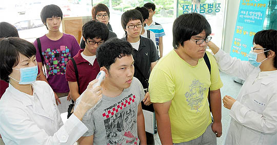 지난 31일 전주지방병무청에서 실시된 징병검사에서 직원들이 징병검사 대상자를 상대로 신종플루 확산 방지를 위해 적외선 귀 체온계를 이용하여 발열검사를 하고 있다.