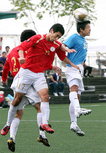 '제40회 전국추계대학축구연맹전' 대회 이튿날 서남대와 한남대의 경기 중 서남대의 33번 장슬기(22)선수가 상대편 선수들의 견제 속에서 헤딩을 하고 있다. 이날 경기는 한남대가 서남대를 1:0으로 이겼다.