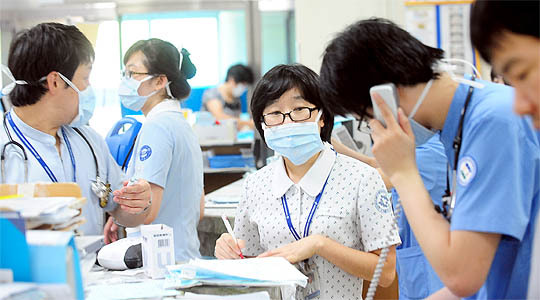 신종플루 환자가 전국적으로 급증하는 가운데 1일 전북대학교병원 응급실에서 의료진들이 마스크를 쓰고 업무를 하고 있다.