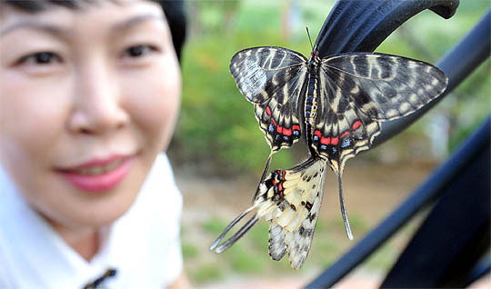 가을 하늘로 날아가던 꼬리명주나비 두마리가 날갯짓을 멈추고 짝짓기에 들어갔다. 사진 위쪽 검은빛이 도는 나비가 암컷, 아래쪽 암컷보다 날개 빛깔이 밝은 것이 수컷이다. 전주자연생태박물관이 3일 꼬리명주나비 생태학습장을 조성, 개장식을 열고 꼬리명주나비를 방사했다.