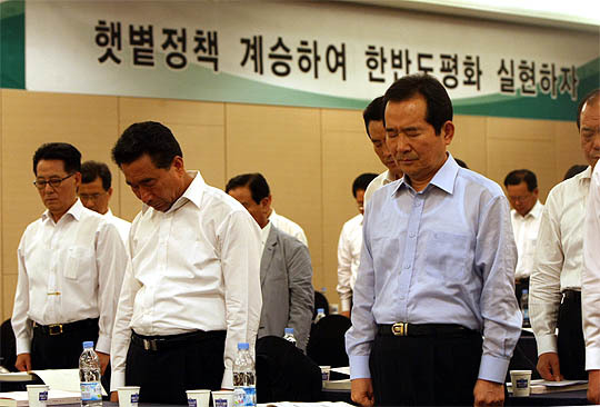 3일 양재동 서울교육문화회관에서 열린 민주당 국회의원 워크숍에서 정세균 대표, 이강래 원내대표 등 의원들이 묵념하고 있다.