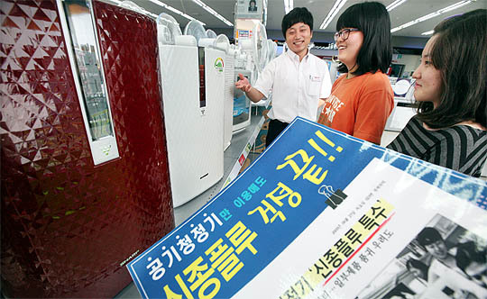 신종플루 예방이 중요시 되고 있는 가운데 전주의 한 가전마트에서 고객들이 직원에게 공기청정기의 위생청정기능에 대해 설명을 듣고 있다.