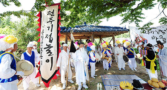 3일 전주 평화2동 학전마을에서 열린 칠월백중 전주기접놀이 행사에서 마을 당산나무에서 마을굿 시연회를 하고 있다.