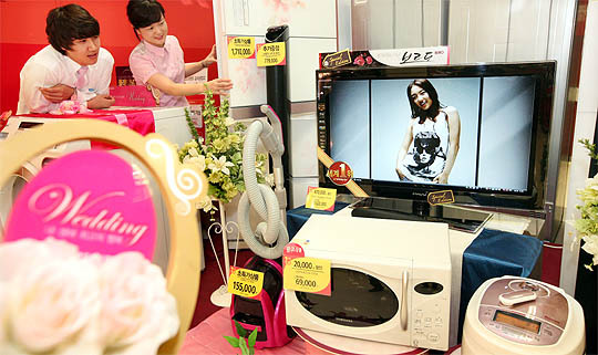 본격적인 가을 웨딩시즌을 맞아 7일 홈플러스전주점에서 고객들이 혼수가전 특별전에 전시된 가전제품을 살펴보고 있다.
