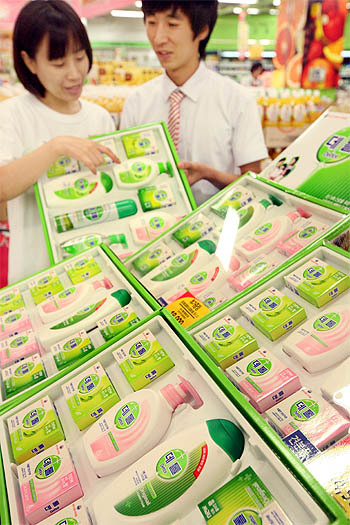 다음달 민족의 대 명절 추석을 앞두고 8일 홈플러스전주점에서 고객들이 개인 위생용품으로 구성된 선물세트를 살펴보고 있다.