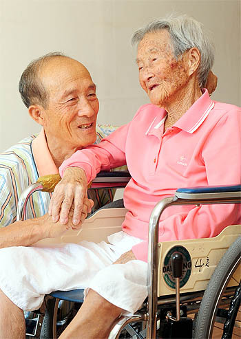 10일 전주시 삼천동의 한 노인요양병원에서 아들 최병한씨와 휠체어에 탄 어머니 이야모씨가 손을 맞잡고 얘기를 나누고 있다.