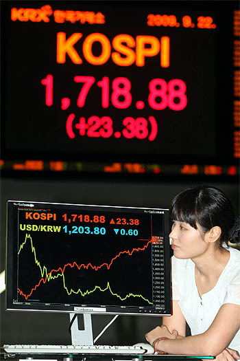 코스피지수가 외국인의 '바이 코리아'를 발판으로 저항선으로 여겨졌던 1,700선을 훌쩍 뛰어넘었다. 22일 코스피지수는 전날보다 23.38포인트(1.38%) 오른 1,718.88을 기록했다. 사진은 이날 오후 서울 여의도 한국거래소 홍보관의 모습.