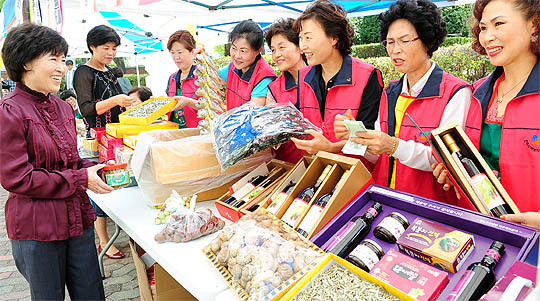 23일 전주시청 민원실 앞에서 열린 추석맞이 시민 알뜰 장터에서 전주온고을 봉사단들이 제수물품을 판매하고 있다.