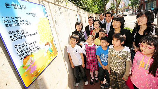 24일 전주 효자공원에서 열린 시와 그림이 있는 거리 조성식에서 참석자들이 서원초등학생의 동시를 감상하고 있다.