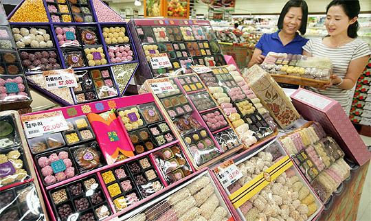 추석을 얼마 남겨두지 않은 28일 하나로클럽전주점에서 고객들이 지인들에게 선물할 한과세트를 고르고 있다.