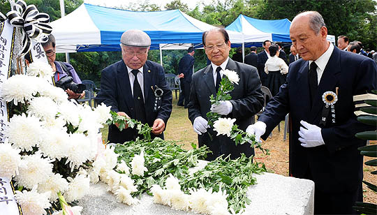 28일 전주 덕진 가련산공원에서 열린 제53회 순국학도의용군 추념식에서 학도의용군들이 헌화 분향을 하고 있다.