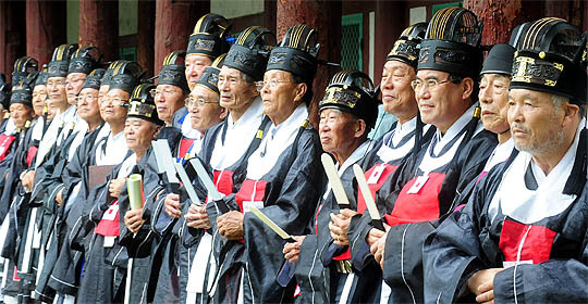 28일 전주 향교 대성전에서 열린 석전대제 봉행에서 참석한 유림들이 봉행식을 마치고 기념촬영을 하고 있다.