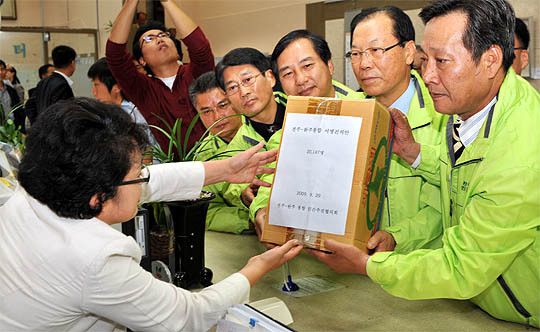 전주·완주 통합 민간추진협의회 관계자들이 29일 오전 전주시청 민원실에 양 지역 통합관련 서명부를 첨부한 건의서를 접수하고 있다.