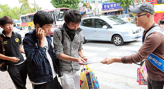 전주 시외버스터미널앞에서 언론악법 반대 거리캠페인을 하고 있는 전북 미디어 공공성위원회 회원들.