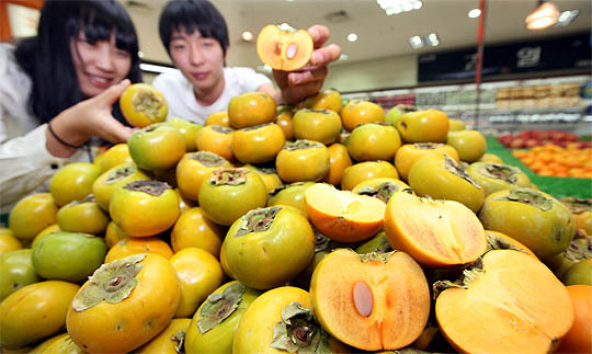 한로를 하루 앞둔 7일 하나로클럽전주점에 단감이 출하돼 고객들이 단감을 고르고 있다. 단감은 체온을 조절하고 감기와 멀미의 예방과 숙취해소에 도움을 주는 것으로 알려져 있다.
