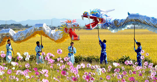 하늘거리는 코스모스 사이로 용놀이가 '제11회 김제 지평선 축제' 개막을 알린다. 오늘부터 11일까지 김제 벽골제 일대에서 열리는 지평선 축제는 가을과 함께 깊어진다.