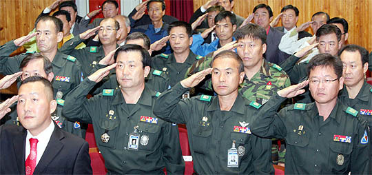 8일 전주시청 강당에서 열린 제57주년 재향군인의 날 행사에 참석자들이 거수경례를 하고 있다.