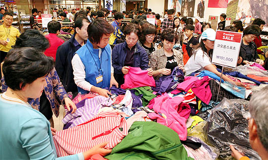 9일부터 이달 25일까지 가을정기세일에 들어간 롯데백화점전주점에 시민들이 몰려 등산복 및 기능성 의류를 고르고 있다.