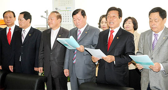 12일 도교육청 기자실에서 도교육위원회와 15개 교육관련 단체 회원들이 올바른 교육자치 실현 서명운동에 앞서 기자회견을 하고 있다.