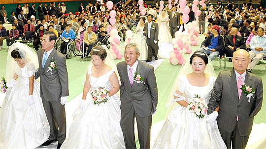 12일 전라북도 장애인 종합복지관에서 열린 동거 장애인 합동 결혼식에 11쌍의 부부가 입장을 하고 있다.