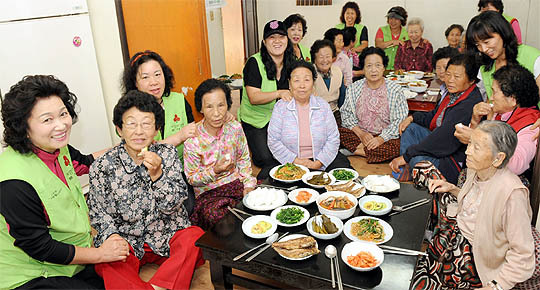 13일 전주 사랑의 열매 봉사단원들이 전주 송천동 무지개 경로당에서 어르신들에게 정성들여 차린 점심을 대접하고 있다.