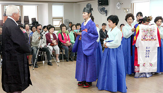 전라북도 노인복지관에서 열린 '혼례예식교육'에서 전통혼례동아리 '전통혼례' 소속의 어르신들이 전통혼례를 재연하고 있다.