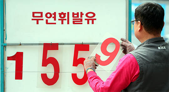 무연휘발유의 가격이 올해 한때 1700원대까지 올라갔다가 국제유가 하락으로 전국평균 1500원대 진입을 눈앞에 두고 있다. 19일 전주시 완산구의 한 주유소에서 직원이 무연휘발유 가격 판을 변경하고 있다.
