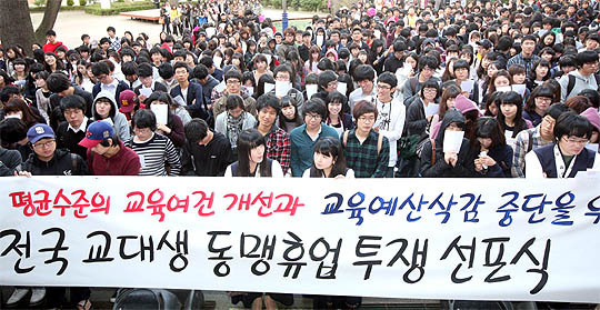 19일 전주교대에서 열린 '전국 교대생 동맹휴업 투쟁 선포식'에 전주교대 학생 1000여명이 본관 정문 앞에 모여 OECD 평균수준의 교육여건 개선과 교육예산 삭감 중단을 외쳤다.