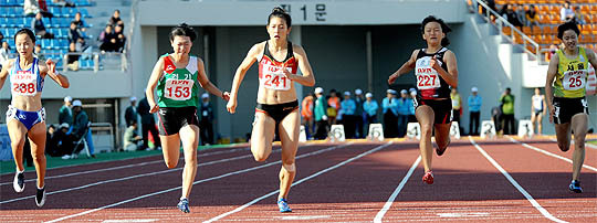 20일 대전 한밭종합운동장에서 열린 여고부 100m 경기에서 금메달을 차지한 김지은 선수(가운데)가 힘차게 달리고 있다.